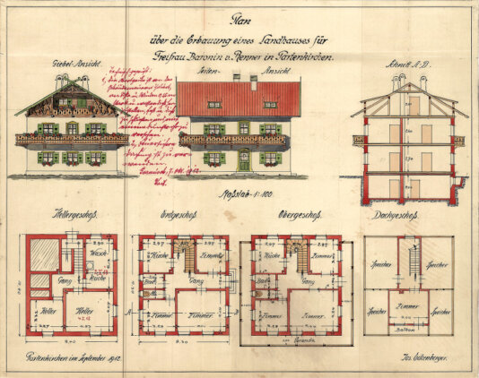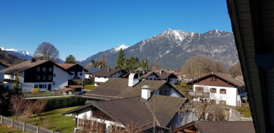 Aufgenommen aus dem Denkmalhaus in Partenkirchen, Mittenwalderstraße 53. Ursprünglich 1912 als Landhaus für Freifrau Baronin von Renner erbaut.